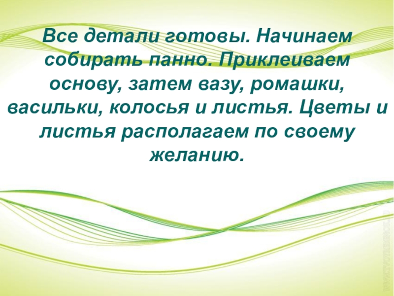 Слайд 21Все детали готовы. Начинаем собирать панно. Приклеиваем основу, затем вазу, ромашки,