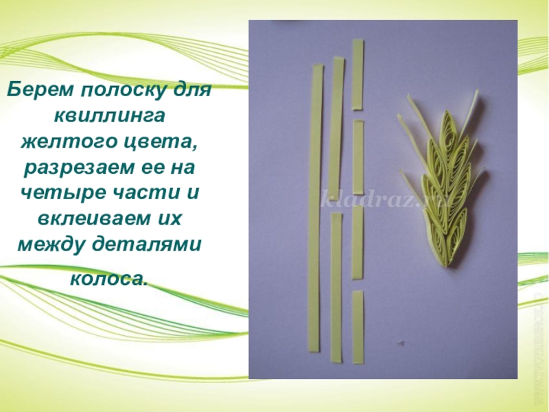 Слайд 19Берем полоску для квиллинга желтого цвета, разрезаем ее на четыре части
