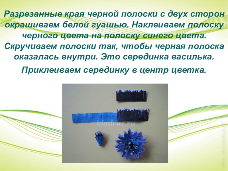 полоску черного цвета на полоску синего цвета. Скручиваем полоски так, чтобы черная полоска оказалась внутри. Это серединка василька. Приклеиваем серединку в центр цветка.