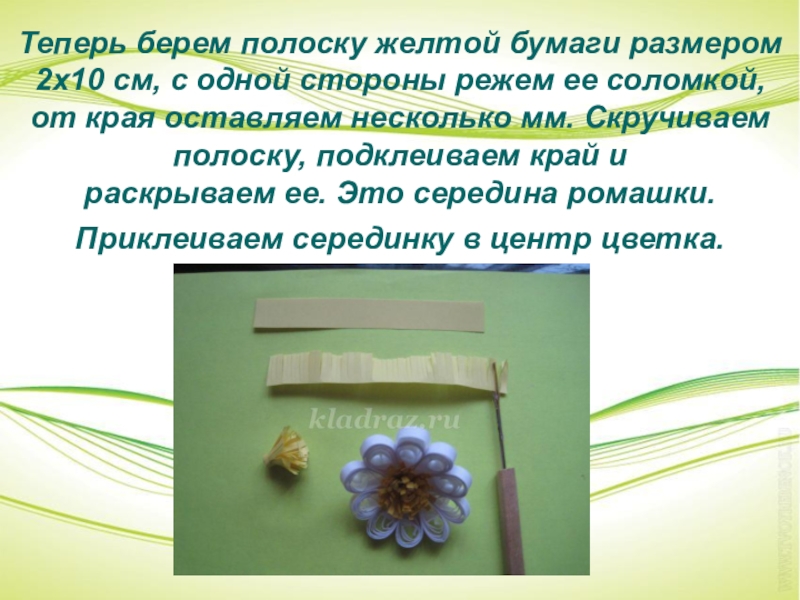 Слайд 10Теперь берем полоску желтой бумаги размером 2х10 см, с одной стороны