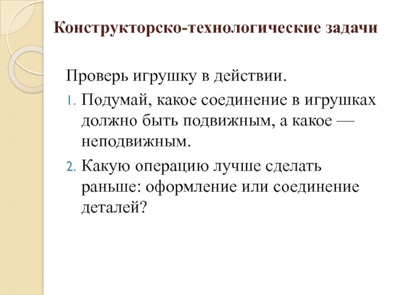 Конструкторско-технологические задачи Проверь игрушку в действии. Подумай, какое соединение в игрушках должно быть подвижным, а какое —