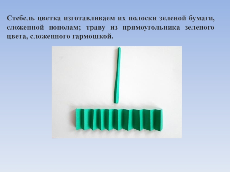 Слайд 8Стебель цветка изготавливаем их полоски зеленой бумаги, сложенной пополам; траву из