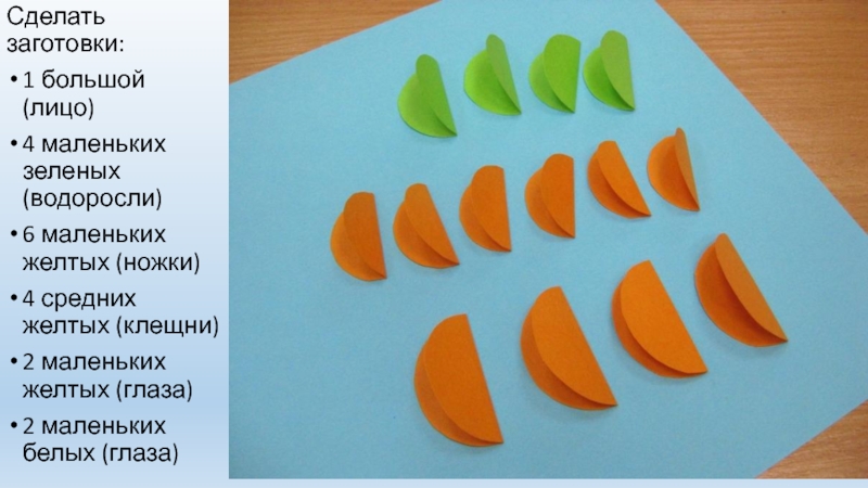 Сделать заготовки:1 большой (лицо)4 маленьких зеленых (водоросли)6 маленьких желтых (ножки)4 средних желтых (клещни)2 маленьких желтых (глаза)2 маленьких
