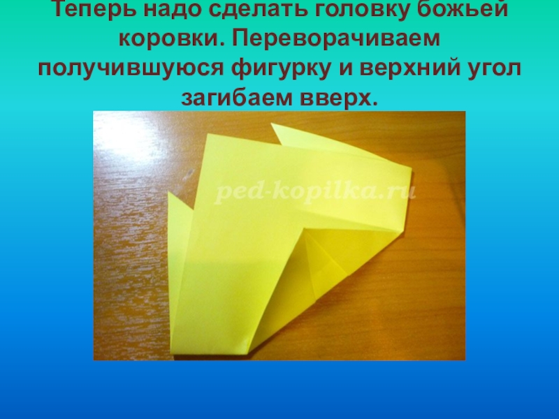 Теперь надо сделать головку божьей коровки. Переворачиваем получившуюся фигурку и верхний угол загибаем вверх.