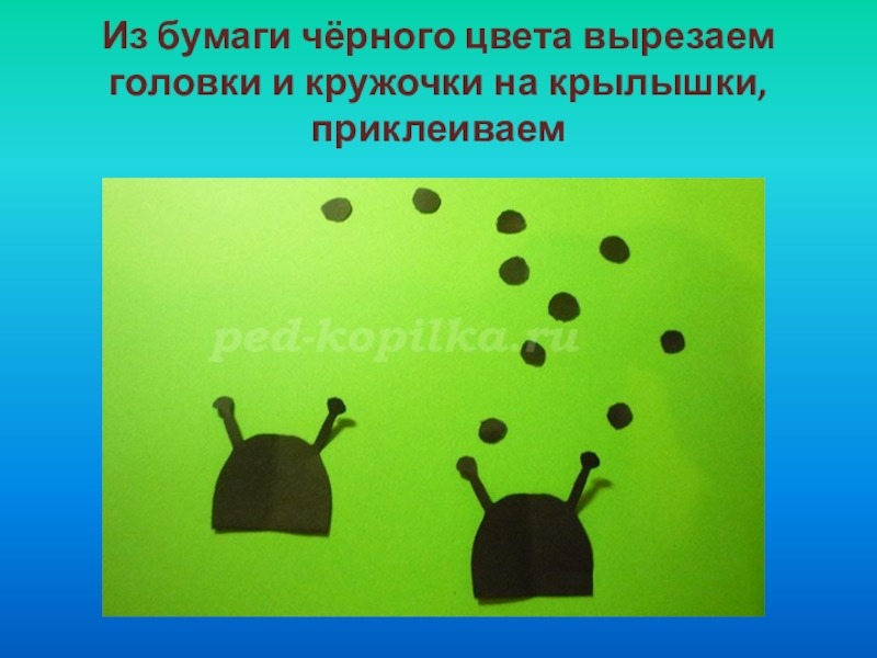 Слайд 20Из бумаги чёрного цвета вырезаем головки и кружочки на крылышки, приклеиваем