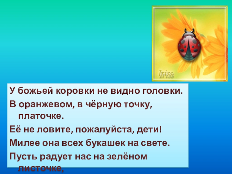 У божьей коровки не видно головки.В оранжевом, в чёрную точку, платочке.Её не ловите, пожалуйста, дети!Милее она всех букашек на свете.Пусть радует нас на зелёном листочке,В оранжевом, в чёрную точку, платочке.