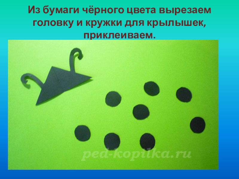 Слайд 11Из бумаги чёрного цвета вырезаем головку и кружки для крылышек, приклеиваем.