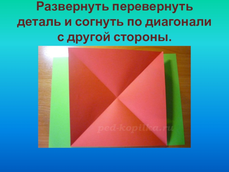 Слайд 6Развернуть перевернуть деталь и согнуть по диагонали с другой стороны.