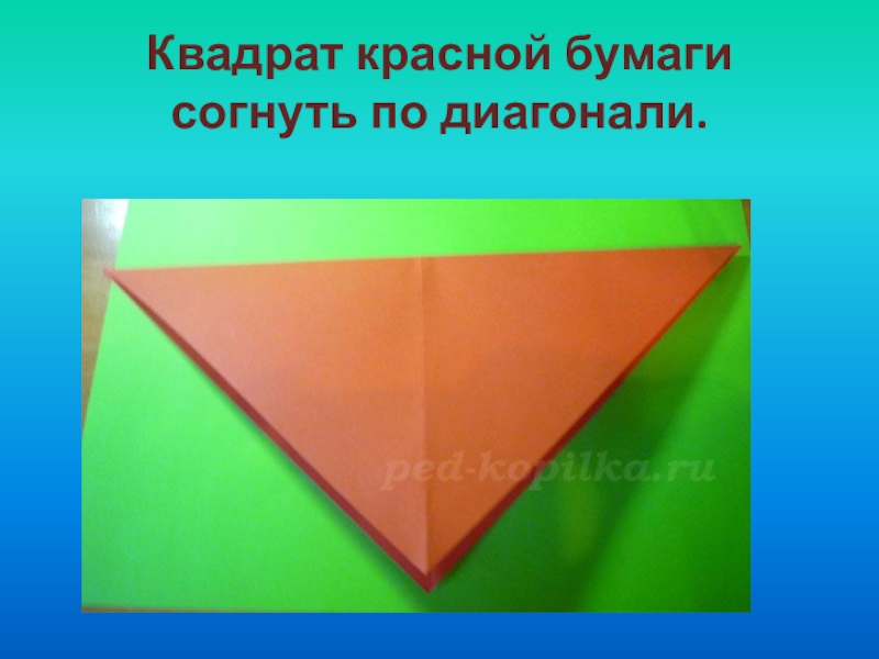 Слайд 5Квадрат красной бумаги согнуть по диагонали.