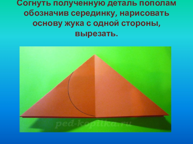 Слайд 8Согнуть полученную деталь пополам обозначив серединку, нарисовать основу жука с одной