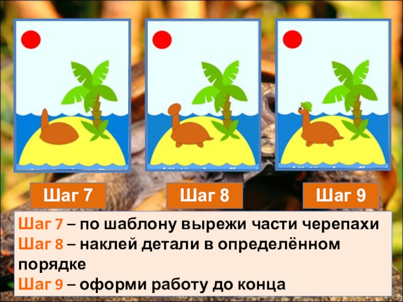 Шаг 7Шаг 8Шаг 9Шаг 7 – по шаблону вырежи части черепахиШаг 8 – наклей детали в определённом