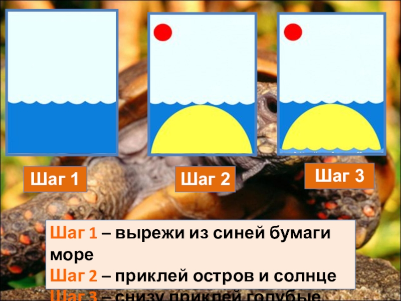 Шаг 1Шаг 2Шаг 3Шаг 1 – вырежи из синей бумаги мореШаг 2 – приклей остров и солнцеШаг 3 – снизу приклей голубые волы