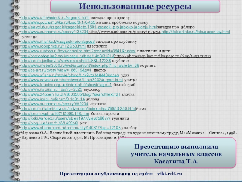 Использованные ресурсыhttp://www.umnyedetki.ru/zagadki.html загадка про корзинуhttp://www.pochemu4ka.ru/load/8-1-0-455 загадка про божью коровкуhttp://slavclub.ru/zagadki/zagadkileto/1501-zagadki-pro-jabloko-jablonju.htmlзагадка про яблокоhttp://www.sunhome.ru/poetry/133234http://www.sunhome.ru/poetry/133234 http://ifolderlinks.ru/foto/gusenitsy.html гусеницаhttp://www.mishka.by/zagadki-pro-yagody загадка про клубникуhttp://www.roboprice.ru/1129/53.html пластилинhttp://www.rustoys.ru/toys/describe.html?productid=3941&rustoy