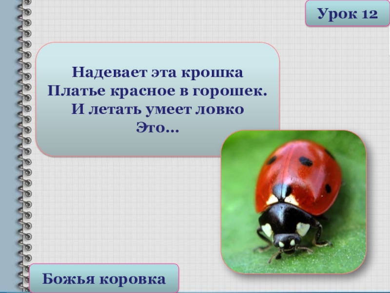 Надевает эта крошкаПлатье красное в горошек.И летать умеет ловкоЭто…Урок 12Божья коровка