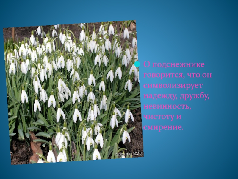 Слайд 8О подснежнике говорится, что он символизирует надежду, дружбу, невинность, чистоту и