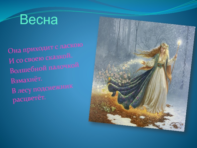 ВеснаОна приходит с ласкоюИ со своею сказкой.Волшебной палочкойВзмахнёт.В лесу подснежник расцветёт.