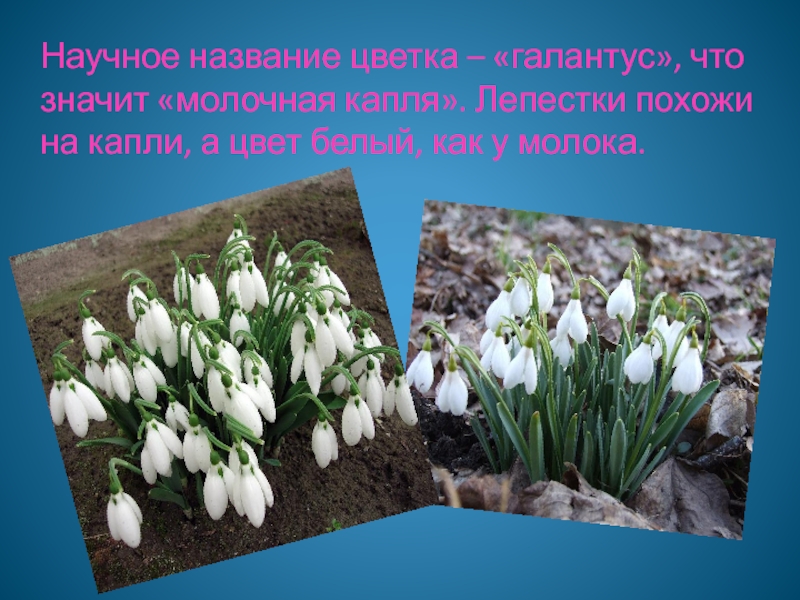 Слайд 6Научное название цветка – «галантус», что значит «молочная капля». Лепестки похожи