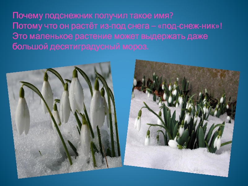 Слайд 5Почему подснежник получил такое имя? Потому что он растёт из-под снега –