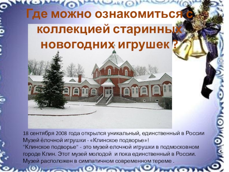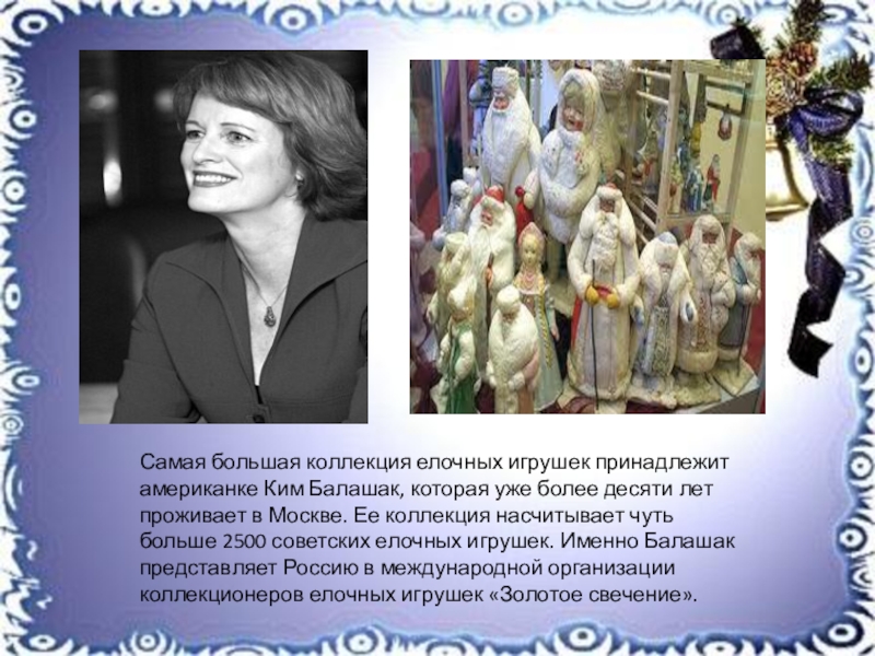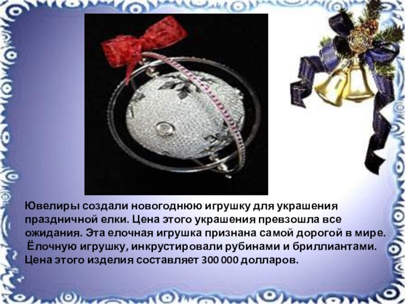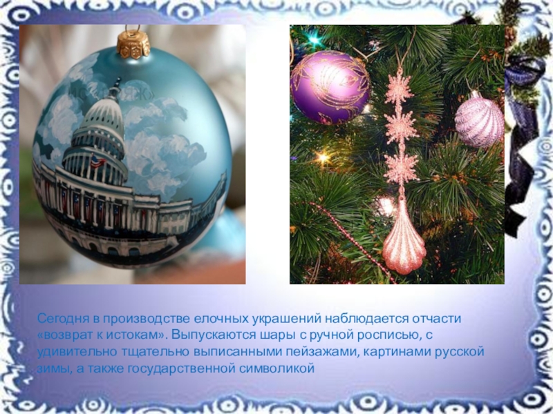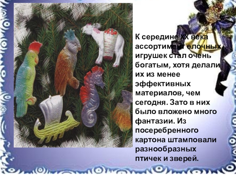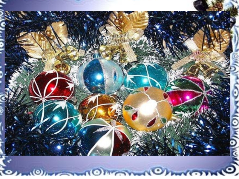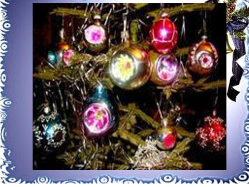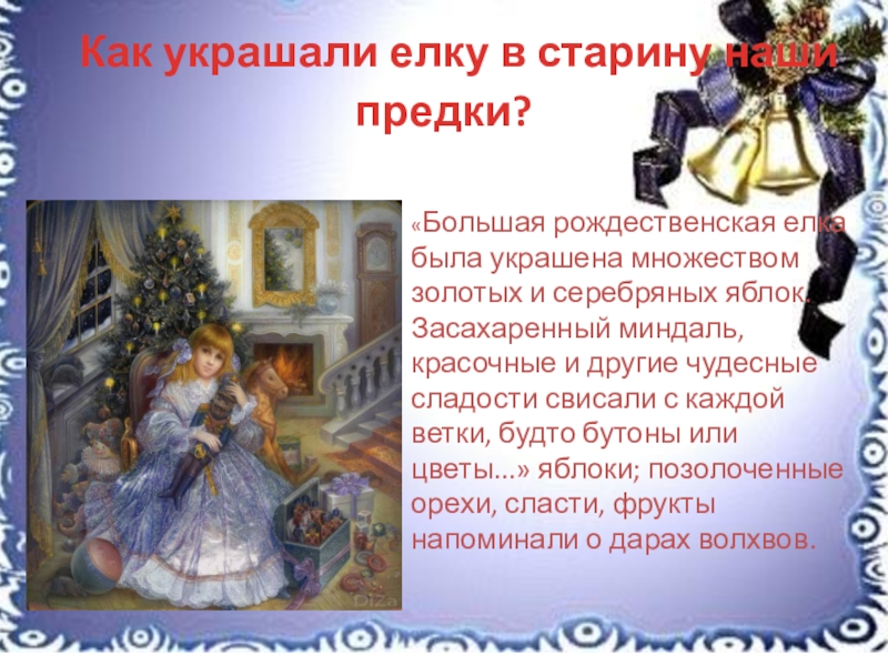 «Большая рождественская елка была украшена множеством золотых и серебряных яблок. Засахаренный миндаль, красочные и другие чудесные сладости свисали с каждой ветки, будто бутоны или цветы...» яблоки; позолоченные орехи, сласти, фрукты напоминали о дарах волхвов.