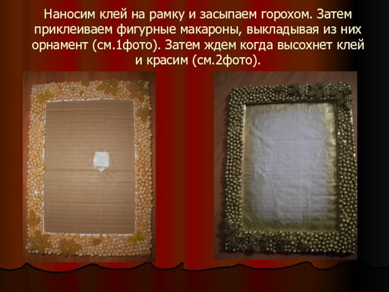Слайд 7Наносим клей на рамку и засыпаем горохом. Затем приклеиваем фигурные макароны,