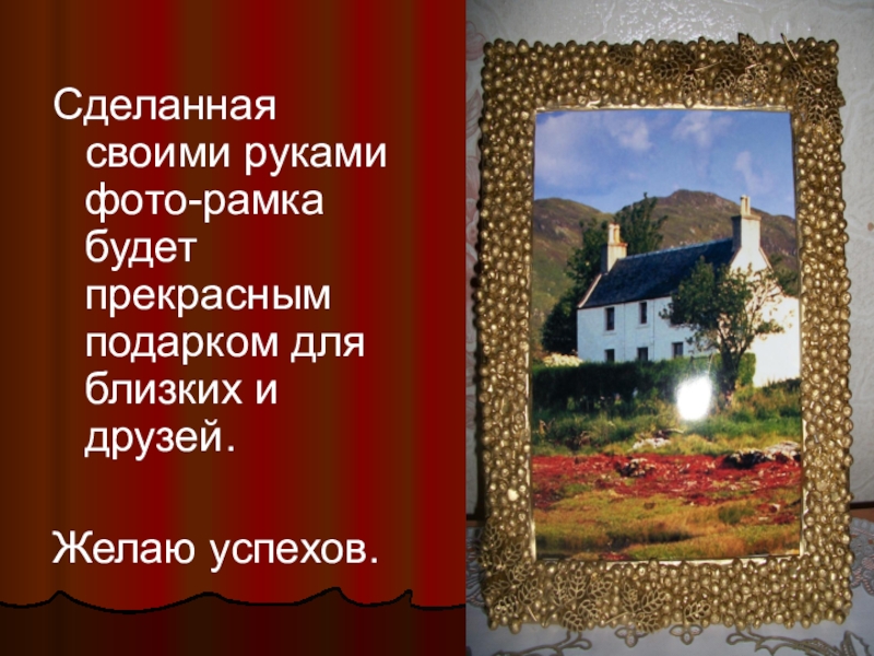 Сделанная своими руками фото-рамка будет прекрасным подарком для близких и друзей.Желаю успехов.