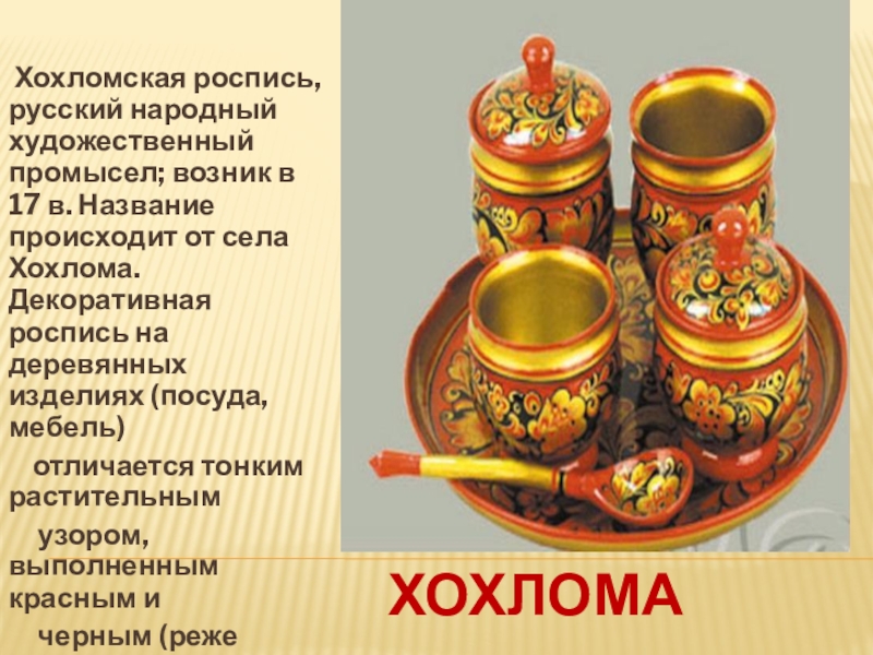 Хохломская роспись, русский народный художественный промысел; возник в 17 в. Название происходит от села Хохлома. Декоративная роспись на деревянных изделиях (посуда, мебель)