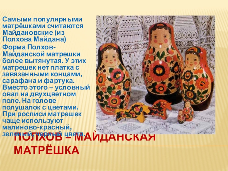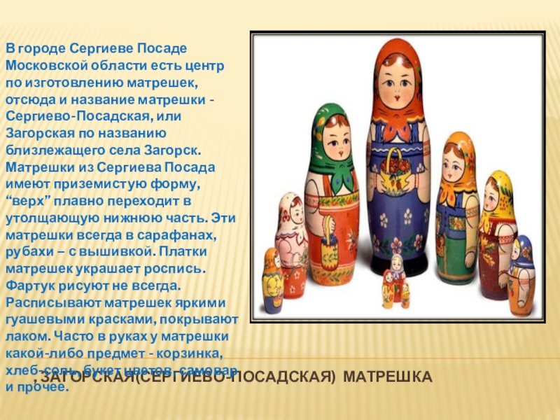 Город Семенов Нижегородской области, как и Сергиев Посад, считается одним из основных центров по росписи матрешек. Матрешки из Семенова имеют большую стройность, “верх” резко переходит в утолщенный “низ”. При росписи матрешек мастера используют три цвета – красный, желтый и синий. Основой композиции в росписи семеновской матрешки считается фартук, на котором изображен пышный букет цветов, который несколько ассиметричен, смещен вправо. Расписывают семеновских матрешек анилиновыми красками, затем лакируют. Семеновская матрешка отличается своей вместительностью – в нее вкладывают до 15-18 кукол. Именно в Семенове была выточена самая большая 72-местная матрешка, высота которой была 1 метр, а диаметр 0, 5 метра.