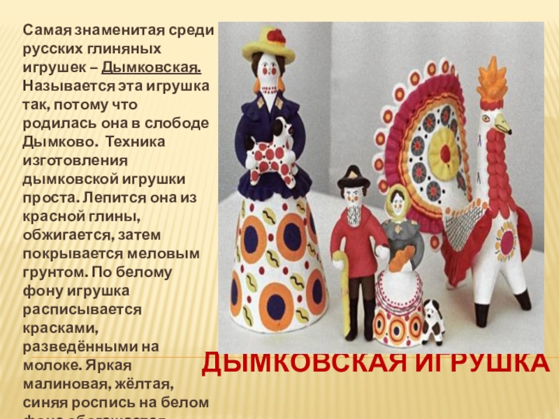 Самая знаменитая среди русских глиняных игрушек – Дымковская. Называется эта игрушка так, потому что родилась она в слободе Дымково. Техника изготовления дымковской игрушки проста. Лепится она из красной глины, обжигается, затем покрывается меловым грунтом. По белому фону игрушка расписывается красками, разведёнными на молоке. Яркая малиновая, жёлтая, синяя роспись на белом фоне обогащается орнаментом в виде точек, кружков, клеточек, зубцов…
