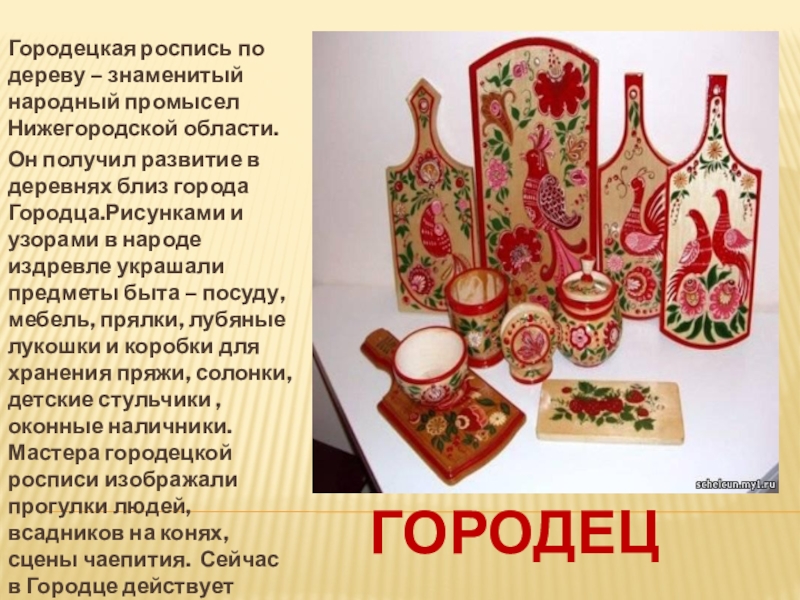 Он получил развитие в деревнях близ города Городца.Рисунками и узорами в народе издревле украшали предметы быта – посуду, мебель, прялки, лубяные лукошки и коробки для хранения пряжи, солонки, детские стульчики , оконные наличники. Мастера городецкой росписи изображали прогулки людей, всадников на конях, сцены чаепития. Сейчас в Городце действует фабрика «Городецкая роспись».