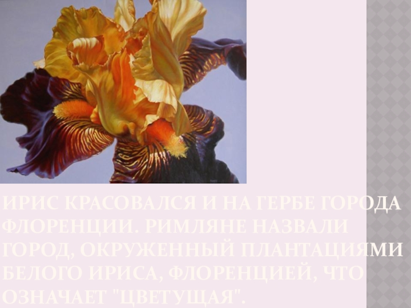 Слайд 4ИРИС КРАСОВАЛСЯ И НА ГЕРБЕ ГОРОДА ФЛОРЕНЦИИ. РИМЛЯНЕ НАЗВАЛИ ГОРОД, ОКРУЖЕННЫЙ