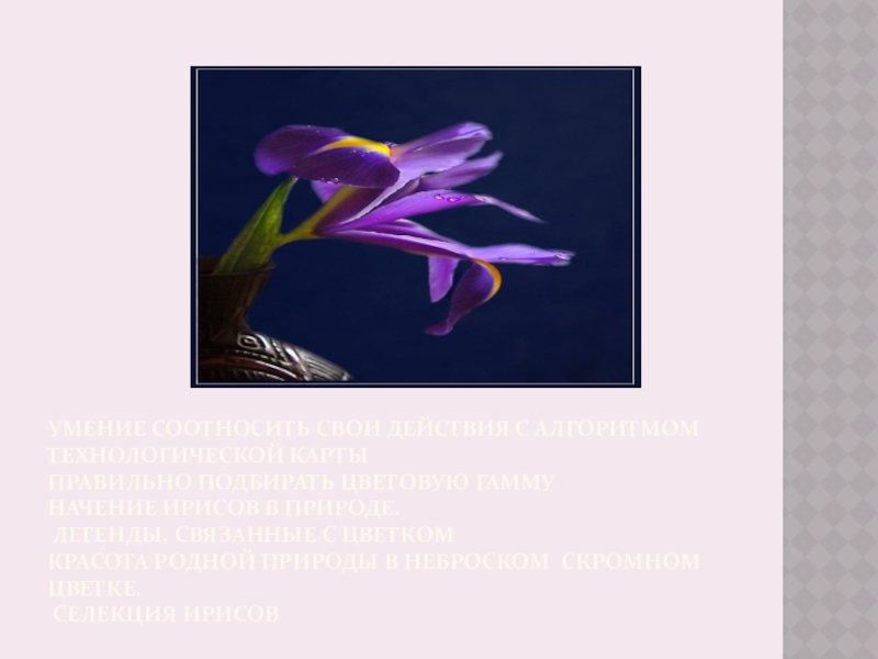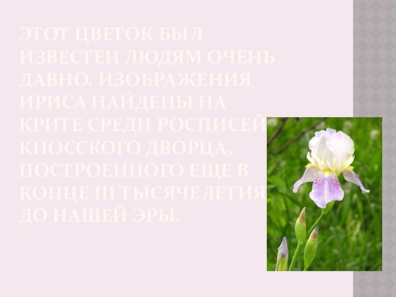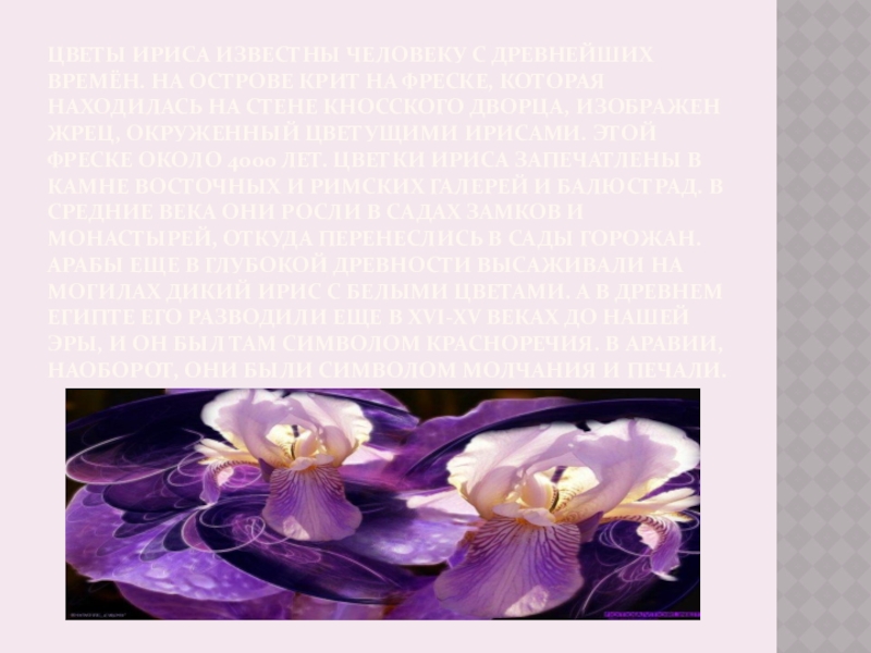 Слайд 9ЦВЕТЫ ИРИСА ИЗВЕСТНЫ ЧЕЛОВЕКУ С ДРЕВНЕЙШИХ ВРЕМЁН. НА ОСТРОВЕ КРИТ НА