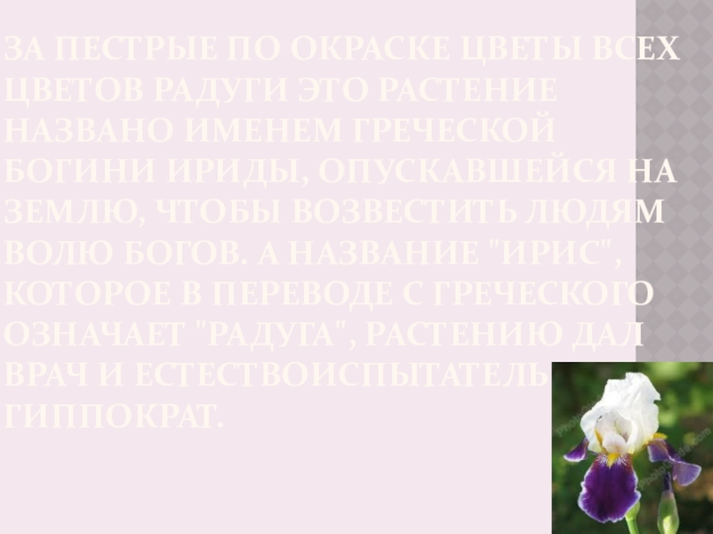 ИМЕНЕМ ГРЕЧЕСКОЙ БОГИНИ ИРИДЫ, ОПУСКАВШЕЙСЯ НА ЗЕМЛЮ, ЧТОБЫ ВОЗВЕСТИТЬ ЛЮДЯМ ВОЛЮ БОГОВ. А НАЗВАНИЕ "ИРИС", КОТОРОЕ В ПЕРЕВОДЕ С ГРЕЧЕСКОГО ОЗНАЧАЕТ "РАДУГА", РАСТЕНИЮ ДАЛ ВРАЧ И ЕСТЕСТВОИСПЫТАТЕЛЬ ГИППОКРАТ.