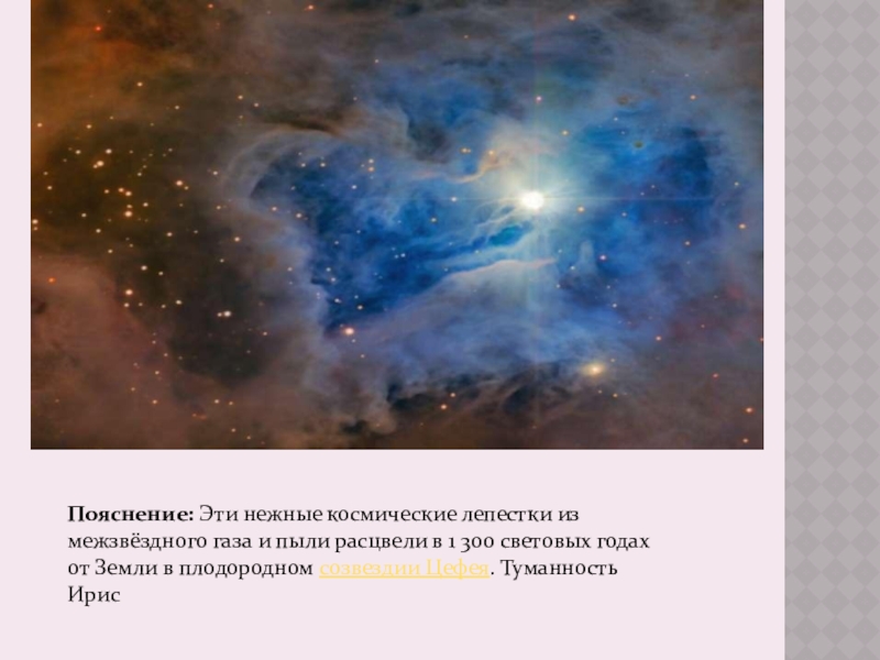Слайд 20Пояснение: Эти нежные космические лепестки из межзвёздного газа и пыли расцвели в