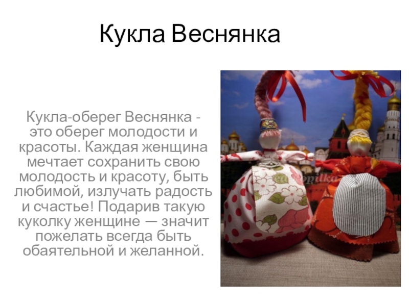 мечтает сохранить свою молодость и красоту, быть любимой, излучать радость и счастье! Подарив такую куколку женщине — значит пожелать всегда быть обаятельной и желанной.