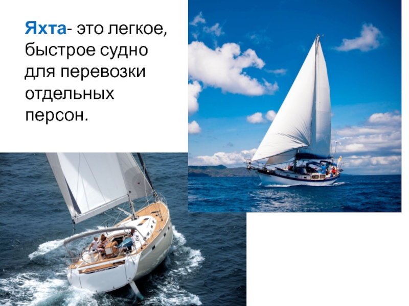 Слайд 4Яхта- это легкое, быстрое судно для перевозки отдельных персон.