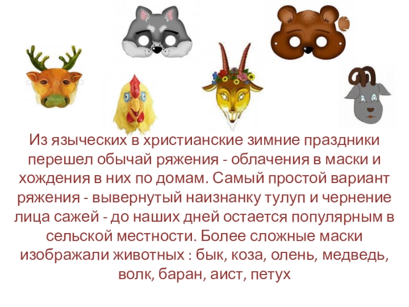 в маски и хождения в них по домам. Самый простой вариант ряжения - вывернутый наизнанку тулуп и чернение лица сажей - до наших дней остается популярным в сельской местности. Более сложные маски изображали животных : бык, коза, олень, медведь, волк, баран, аист, петух