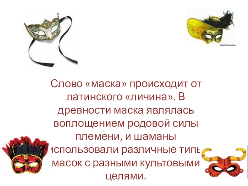 Слайд 3Слово «маска» происходит от латинского «личина». В древности маска являлась воплощением