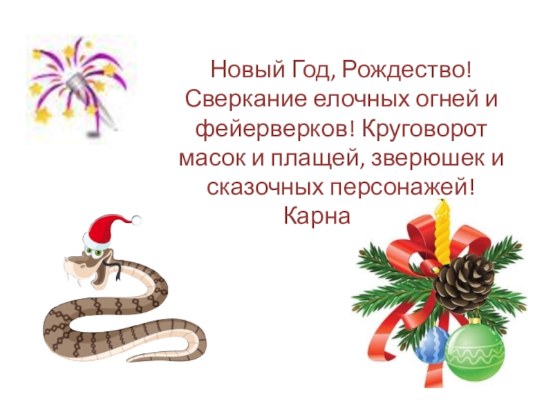 Слайд 2Новый Год, Рождество! Сверкание елочных огней и фейерверков! Круговорот масок и