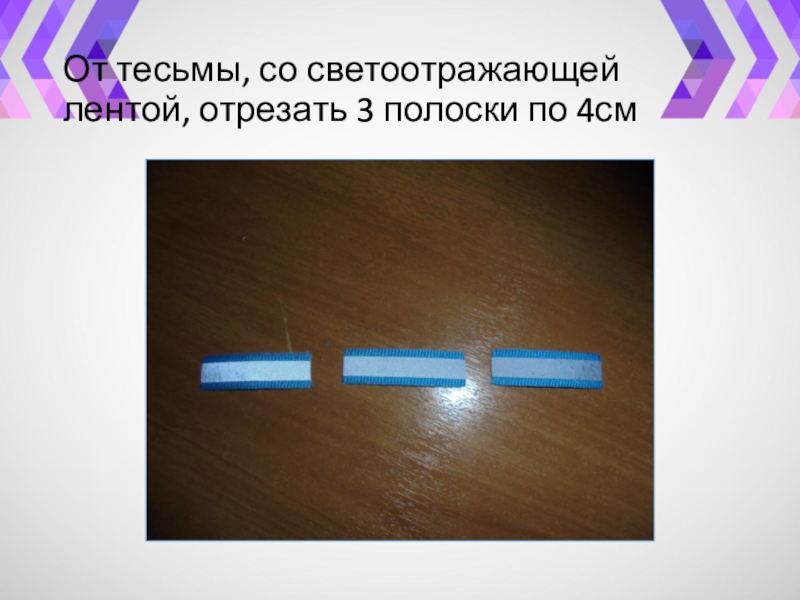 Слайд 4От тесьмы, со светоотражающей лентой, отрезать 3 полоски по 4см