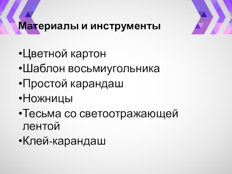 Материалы и инструментыЦветной картонШаблон восьмиугольникаПростой карандашНожницыТесьма со светоотражающей лентойКлей-карандаш
