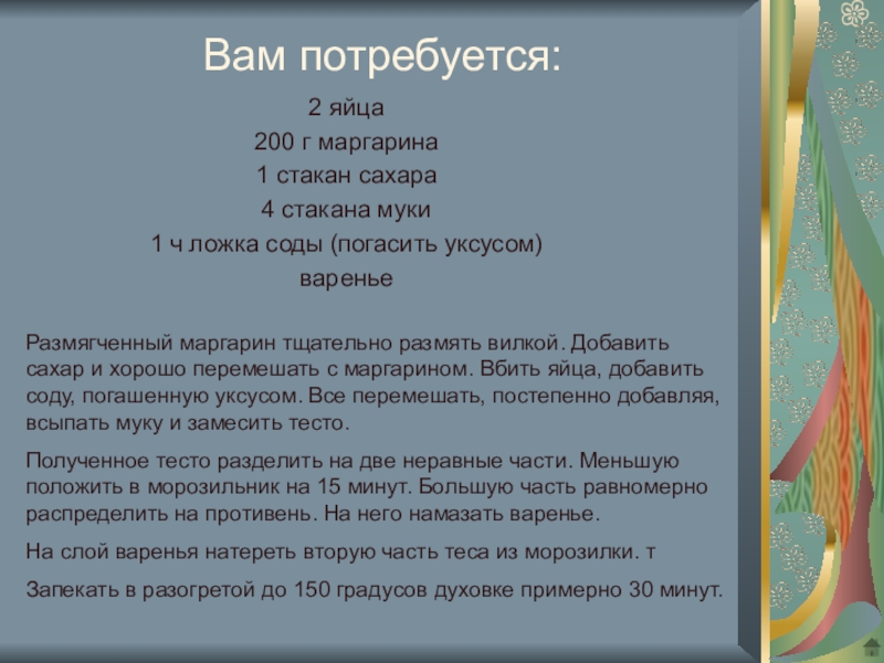 Полученное тесто разделить на две неравные части. Меньшую положить в морозильник на 15 минут. Большую часть равномерно распределить на противень. На него намазать варенье.