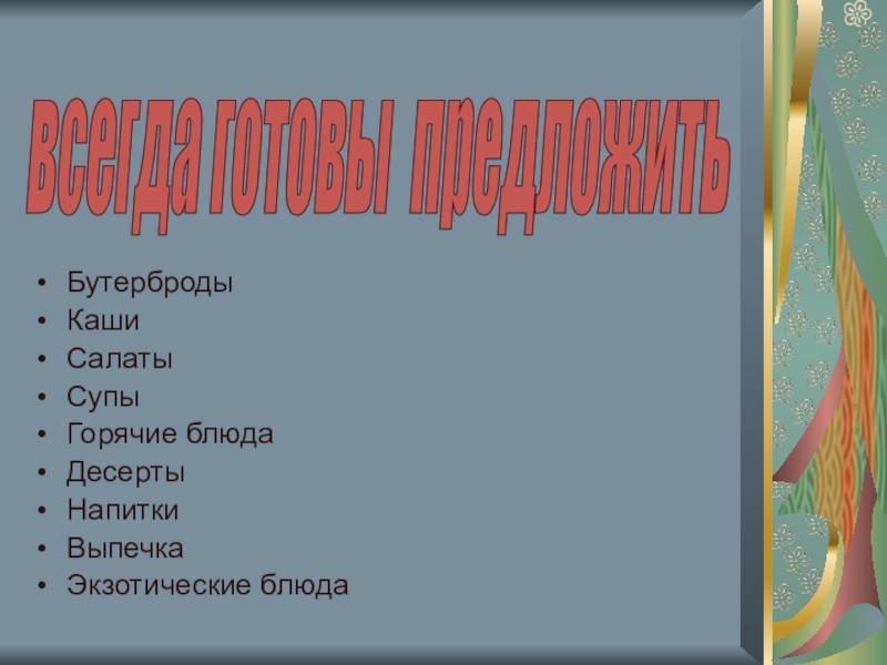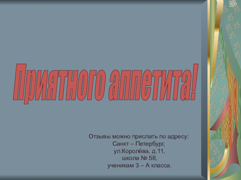 Это сайт презентаций, где можно хранить и обмениваться своими презентациями, докладами, проектами, шаблонами в формате PowerPoint с другими пользователями. Мы помогаем школьникам, студентам, учителям, преподавателям хранить и обмениваться учебными материалами.