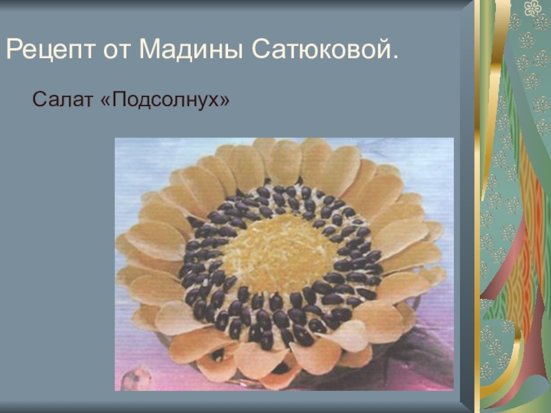 Чипсами украсить в виде лепестков подсолнуха. Оливки порезать колечками и уложить в виде семечек подсолнуха.