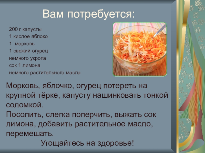 Морковь, яблочко, огурец потереть на крупной тёрке, капусту нашинковать тонкой соломкой.
