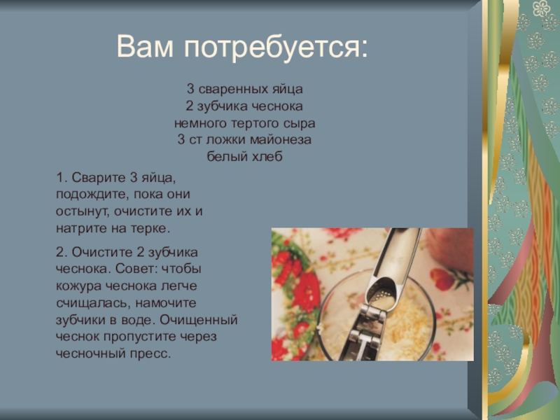2. Очистите 2 зубчика чеснока. Совет: чтобы кожура чеснока легче счищалась, намочите зубчики в воде. Очищенный чеснок пропустите через чесночный пресс.