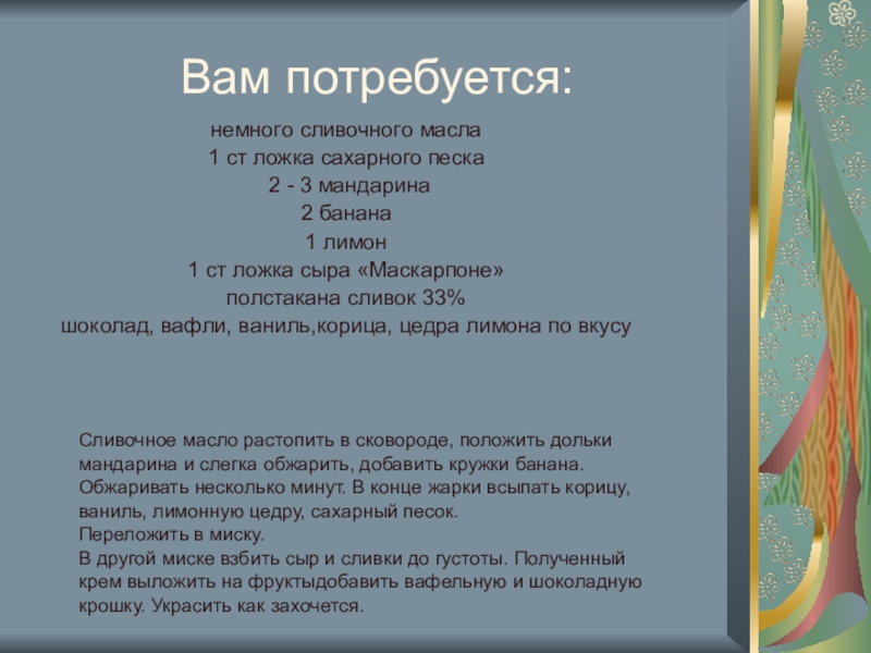 Сливочное масло растопить в сковороде, положить дольки мандарина и слегка обжарить, добавить кружки банана. Обжаривать несколько минут. В конце жарки всыпать корицу, ваниль, лимонную цедру, сахарный песок.
