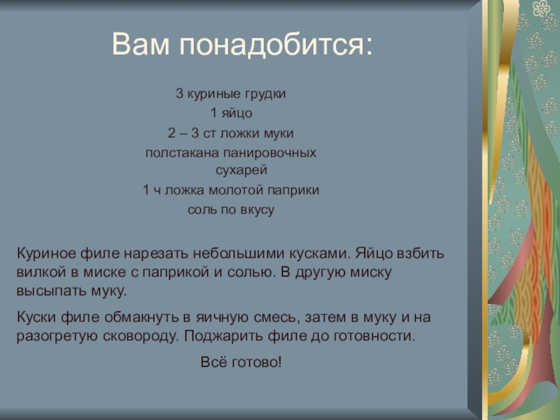 Куриное филе нарезать небольшими кусками. Яйцо взбить вилкой в миске с паприкой и солью. В другую миску высыпать муку.