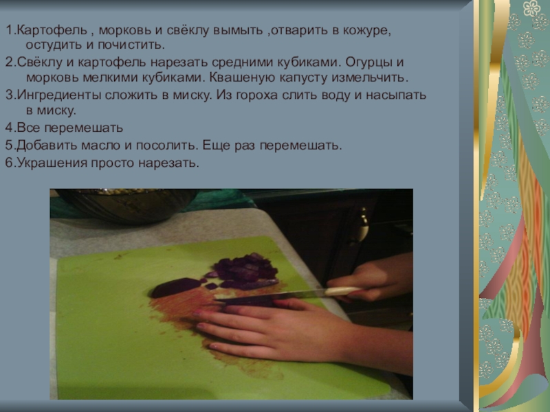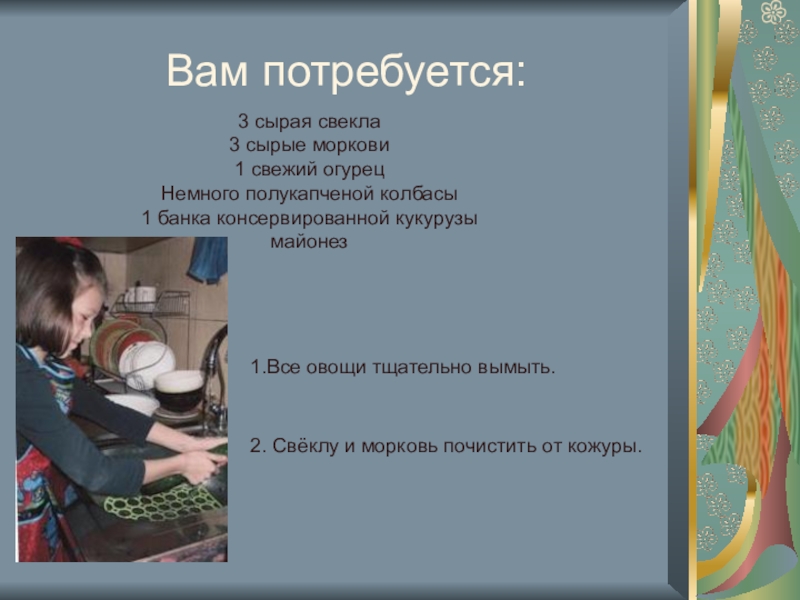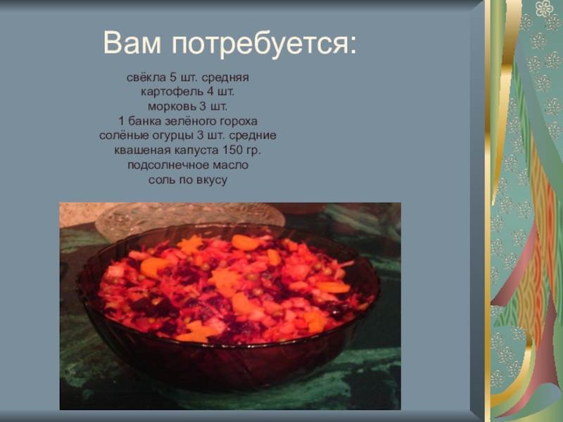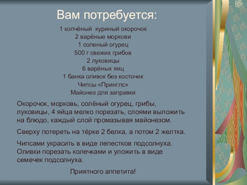 Окорочок, морковь, солёный огурец, грибы, луковицы, 4 яйца мелко порезать, слоями выложить на блюдо, каждый слой промазывая майонезом.