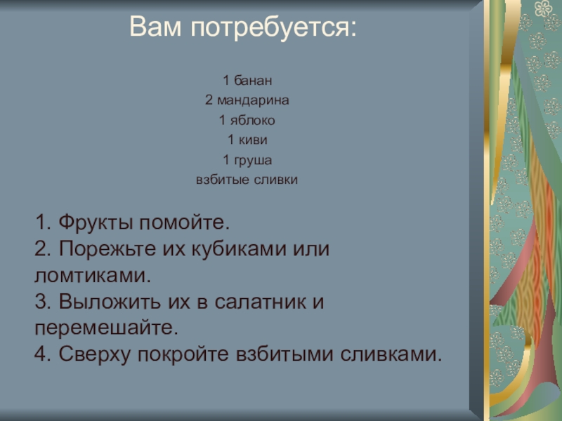 В другой миске взбить сыр и сливки до густоты. Полученный крем выложить на фруктыдобавить вафельную и шоколадную крошку. Украсить как захочется.
