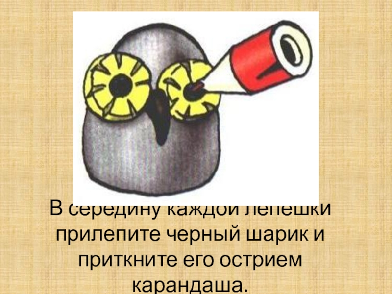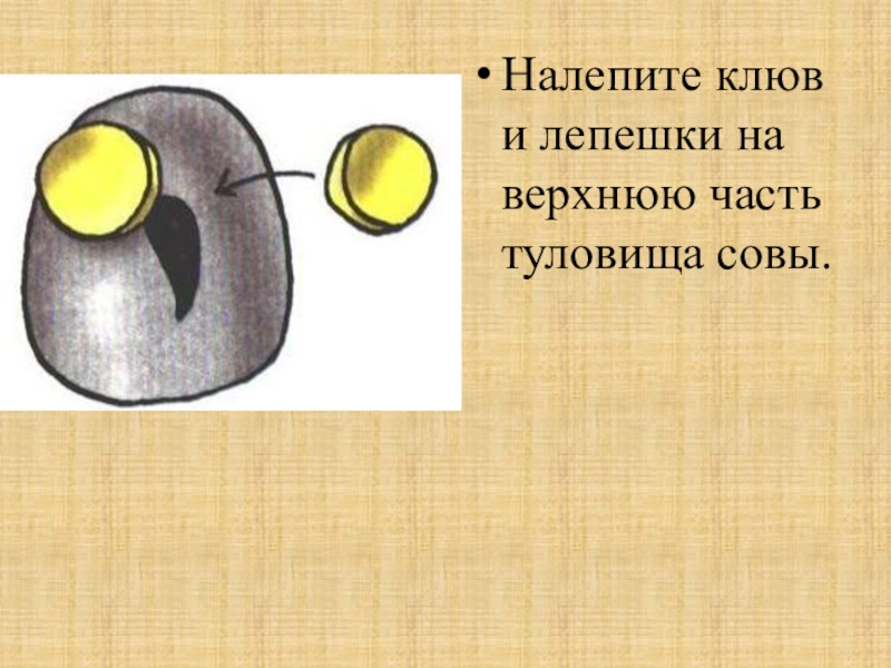 Слайд 4Налепите клюв и лепешки на верхнюю часть туловища совы.